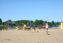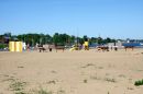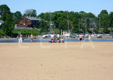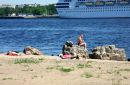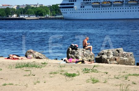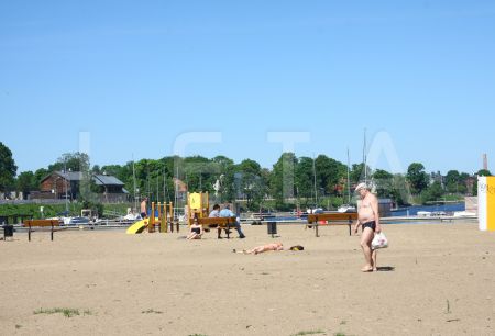 Cilvēki Ķīpsalas pludmalē pie Vanšu tilta.