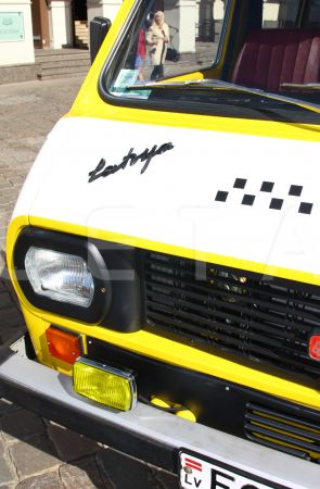 Uzraksts mikroautobusā "Latvija" RAF 2203, ar kuru ekspedīcijas "No ...