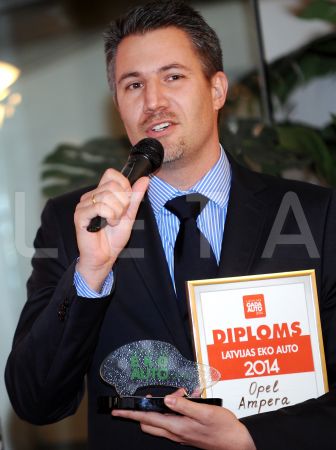 "Opel Ampera" pārstāvis, saņemot balvu "Latvijas eko auto", konkursa ...