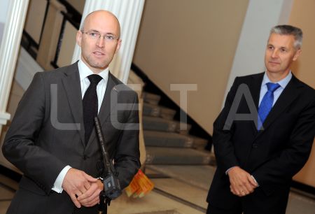 Aizsardzības ministrs Artis Pabriks (no labās) un ekonomikas ministrs ...