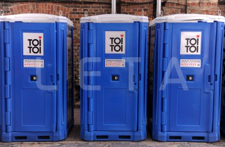 Pārvietojamās tualetes pie Spīķeru laukuma.