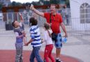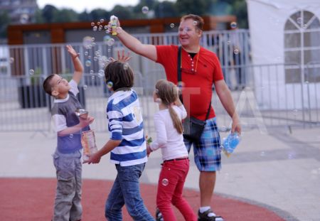 Vīrietis ar bērniem laiž ziepju burbuļus.