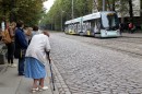 Cilvēki gaida tramvaju sabiedriskā transporta pieturvietā.