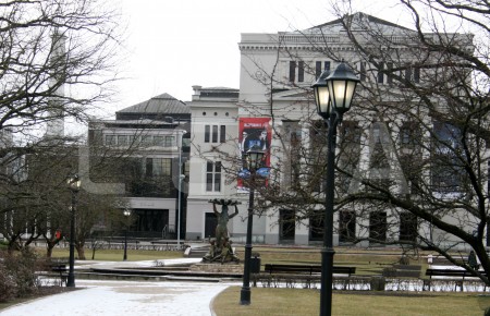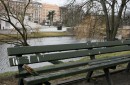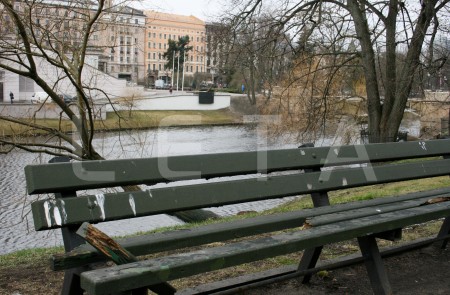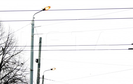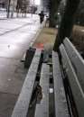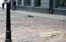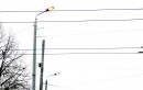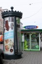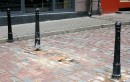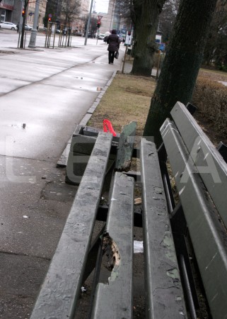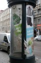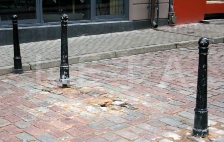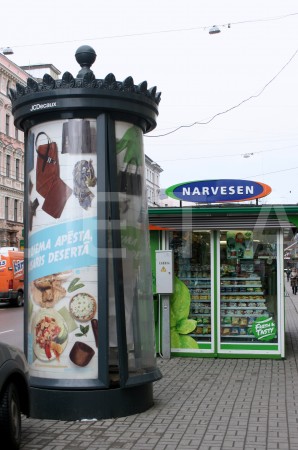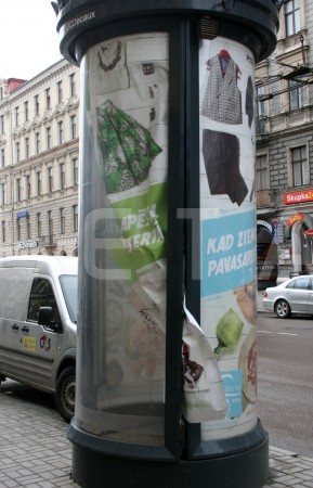 Sabojāts reklāmas stabs Merķeļa ielā.