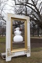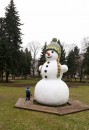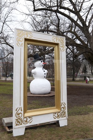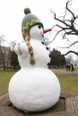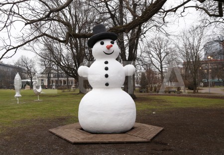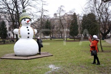Cilvēki fotografējas pie sniegavīra Vērmanes dārzā.
