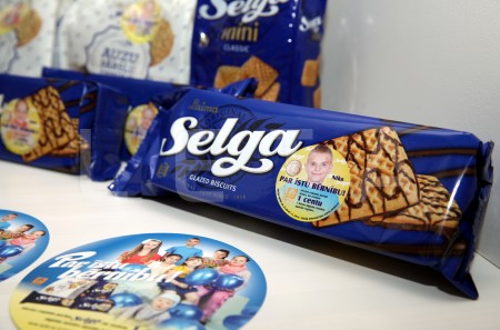 Zīmola "Selga" cepumi ar akcijas "Par īstu bērnību" uzlīmēm.