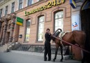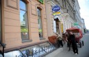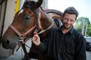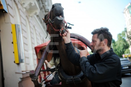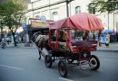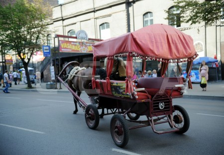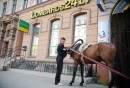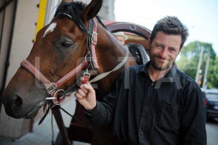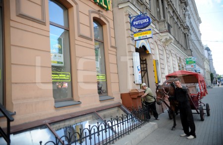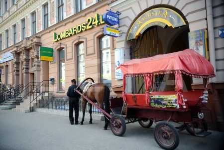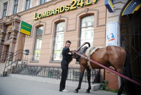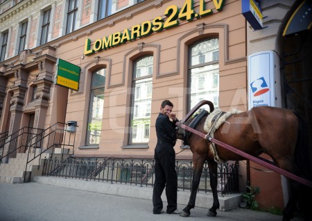 Vīrietis ar zirga pajūgu pie lombarda Merķeļa ielā.
