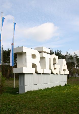 Uzraksts "Rīga" pirms Dārziņiem uz Daugavpils šosejas.