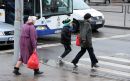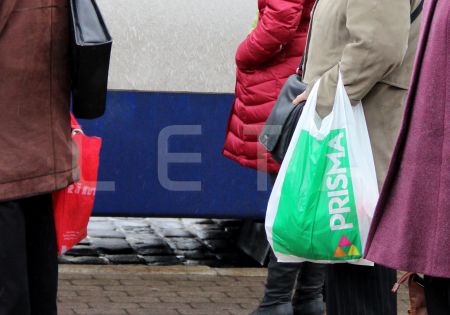 Cilvēki uz ielas ar iepirkumu maisiņiem.