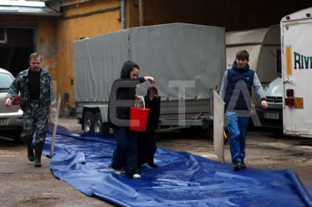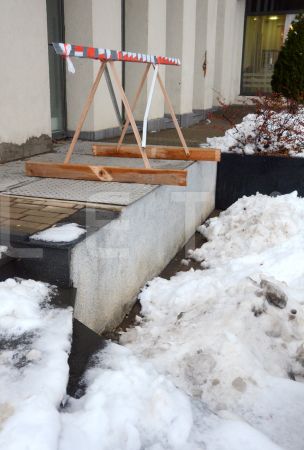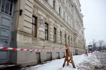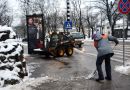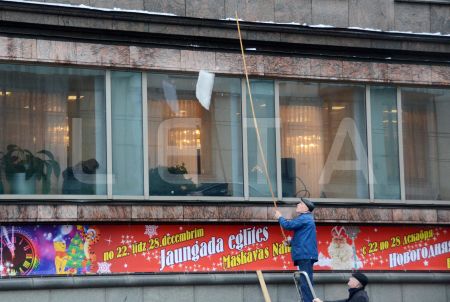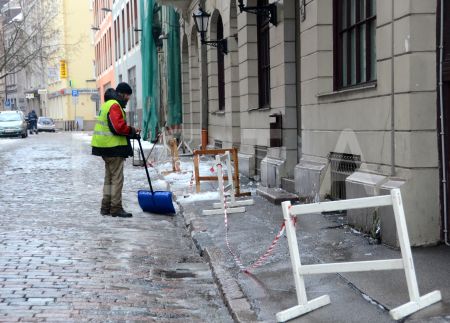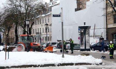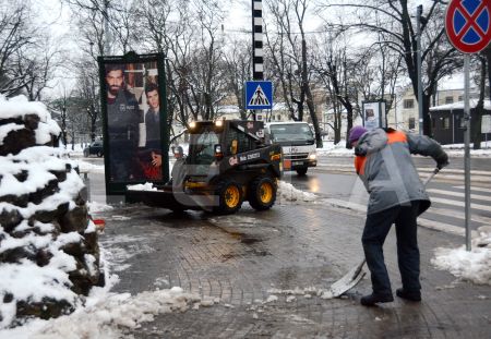 Notiek sniega un ledus novākšana no ietves Zigfrīda Annas Meirovica ...