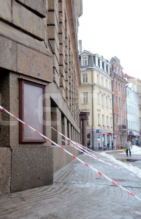 Ar drošibas lentām un barjerām norobežotās ietve Doma laukumā, kur ...