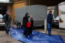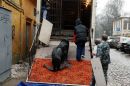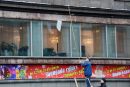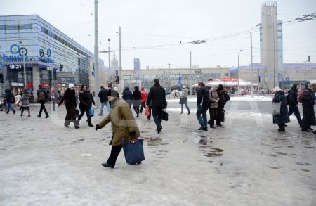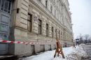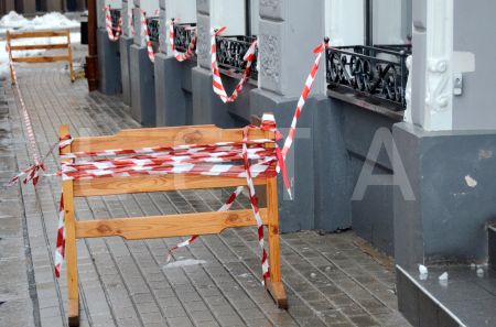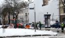 Vīrieši tīra ledu no Maskavas nama karnīzēm.