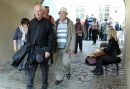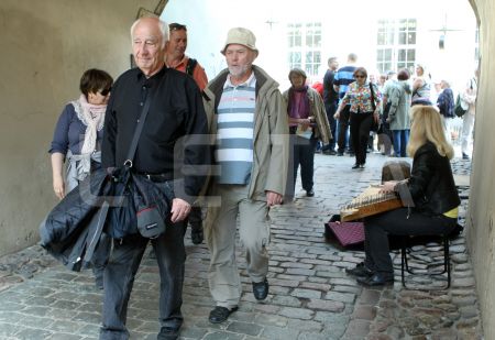 Tūristi un ielu muzikante Vecrīgā.