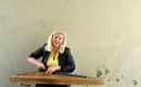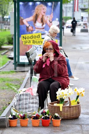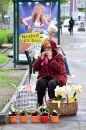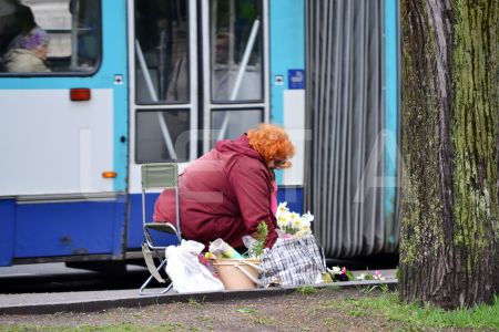 Sieviete uz ielas tirgo ziedus.