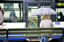 Sieviete ar lietussargu sabiedriskā transporta pieturvietā.