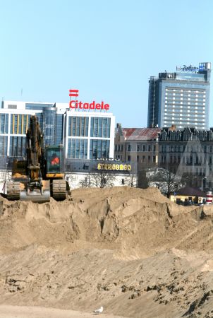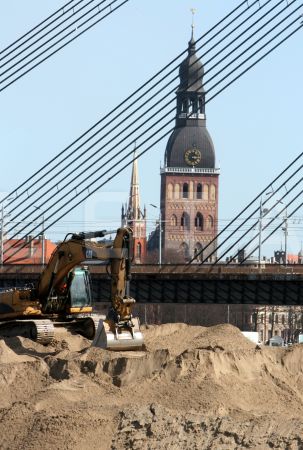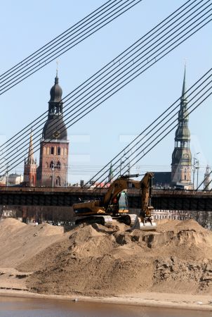 Smilšu kaudze pie Vanšu tilta un Vecrīgas baznīcu torņi.