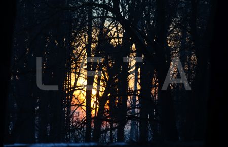 Saullēkts caur kokiem.