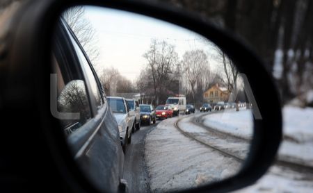 Automašīnu rinda atpakaļskata spogulī.
