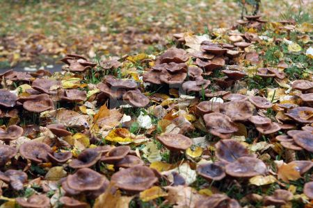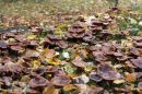 Sēnes un rudens lapas Vienības gatves zālienā.