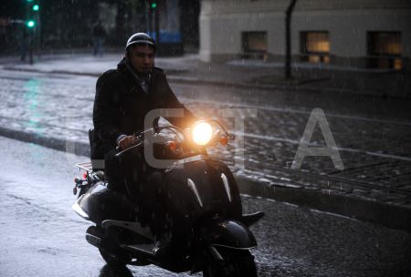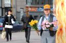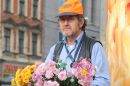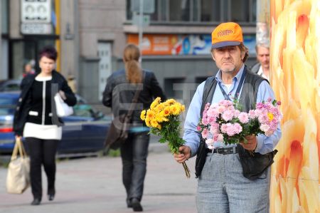 Vīrietis uz ielas tirgo mārtiņrozes.