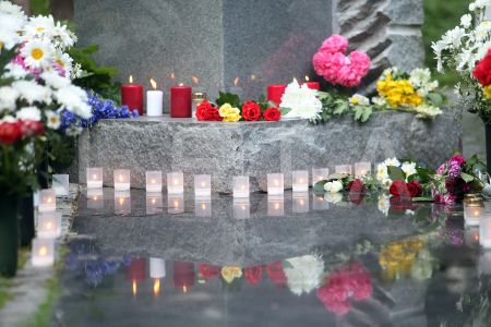 Sveces un ziedi pie pieminekļa Rīgas 1.Meža kapu Balto krustu ...