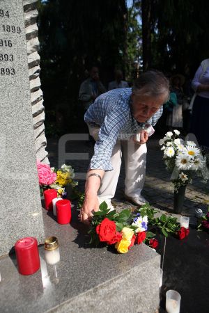 Sieviete noliek ziedus pie pieminekļa Rīgas 1.Meža kapu Balto krustu ...
