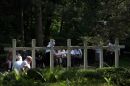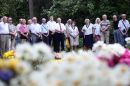 Cilvēki noliek ziedus pie pieminekļa Rīgas 1.Meža kapu Balto krustu ...