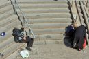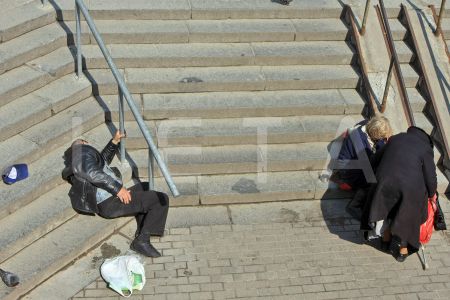 "Saguris" vīrietis un sievietes uz tuneļa kāpnēm.