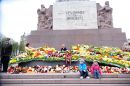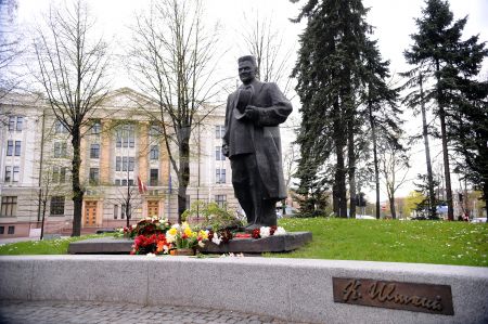 Ziedi pie Kārļa Ulmaņa pieminekļa.