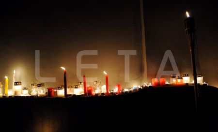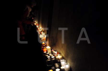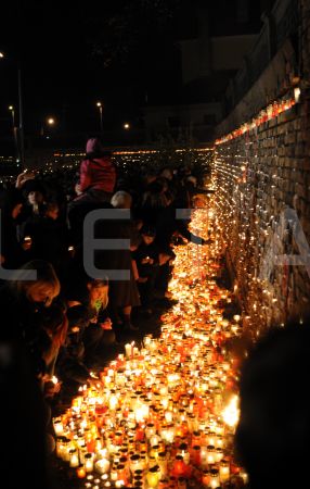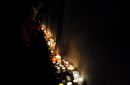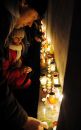 Cilvēki noliek sveces 11.novembra krastmalā par godu Lāčplēša dienai.