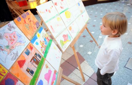 Zēns aplūko zīmējumu izstādi "Mana Latvija" tirdzniecības centrā ...