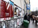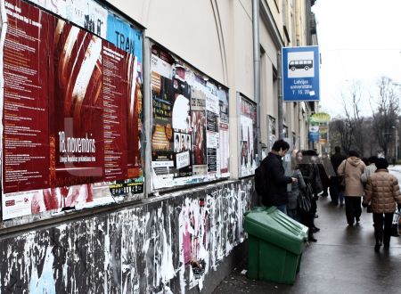 Siena ar afišām sabiedriskā transporta pieturvietā Inženieru ielā.