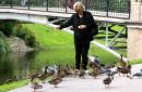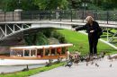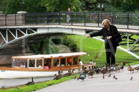 Sieviete pilsētas kanālmalā baro pīles un baložus.
