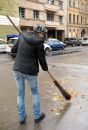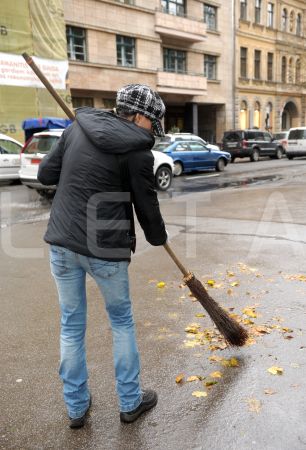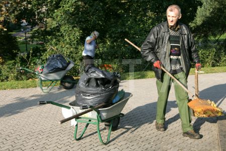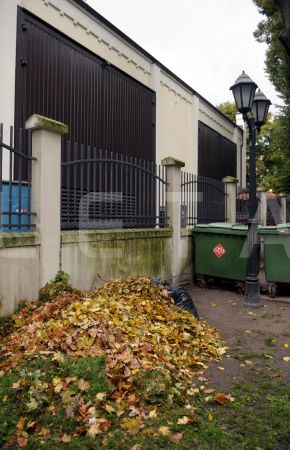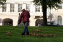 Strādnieki vāc rudens lapas.