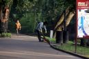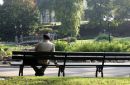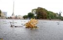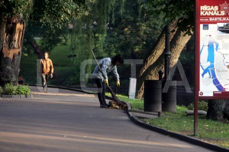 Sieviete grābj lapas skvērā pie Latvijas Universitātes.