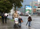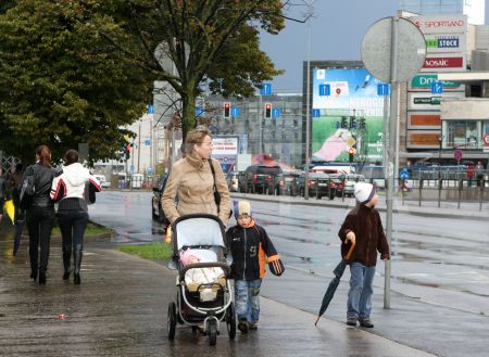 Sieviete ar bērniem lietainā laikā.