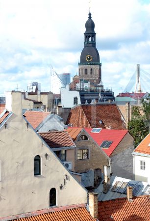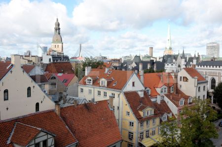 Skats uz Vecrīgas namu jumtiem.