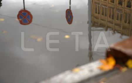 Ceļa zīmju atspulgs ūdenī.