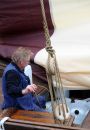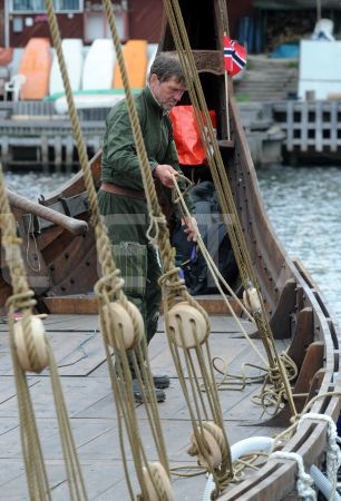 Latvijā būvētā vikingu kuģa "Osa" kapteinis Eivinns Eks veic ...