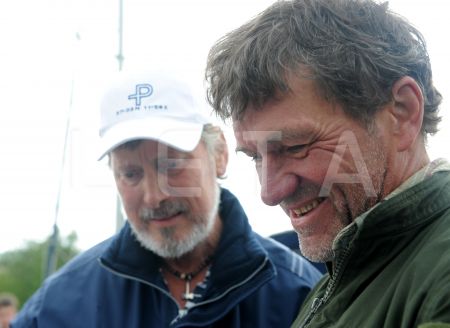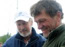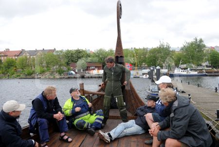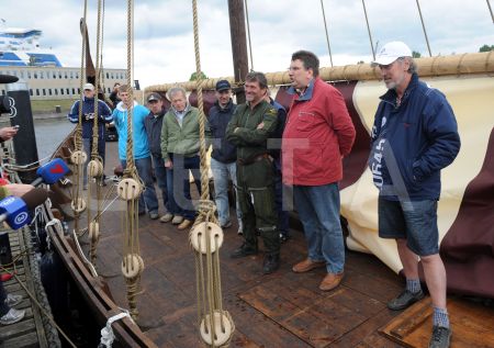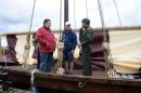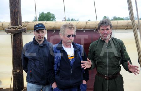 Latvijā būvētā vikingu kuģa "Osa" kapteinis Eivinns Eks (no labās) ar ...