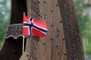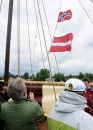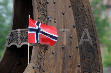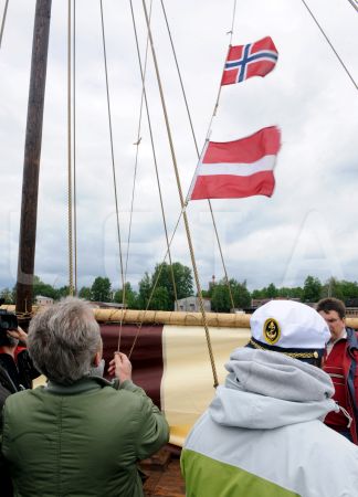 Latvijā būvētā vikingu kuģa "Osa" mastā tiek uzvilkti Norvēģijas un ...