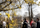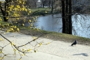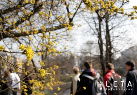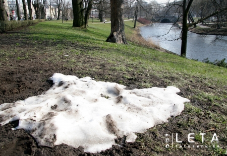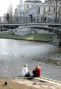 Jaunietes bauda silto pavasara dienu Rīgas kanālmalā.