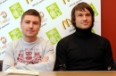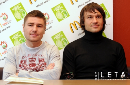Futbolisti Marians Pahars (no kreisās) un Vitālijs Astafjevs piedalās ...
