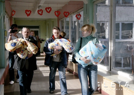 Trīnīšu vecāki Žanna un Nikolajs Čamaņi ar trīnīšiem - meitenītēm ...