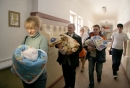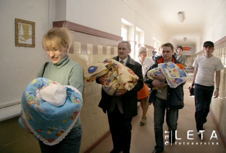 Trīnīšu vecāki Nikolajs un Žanna Čamaņi un vectēvs dodas mājup ar ...