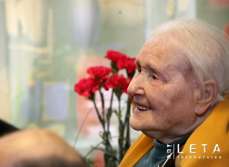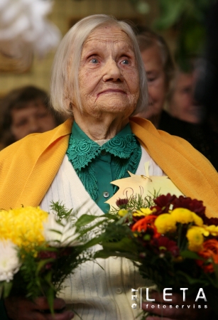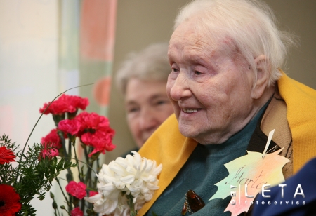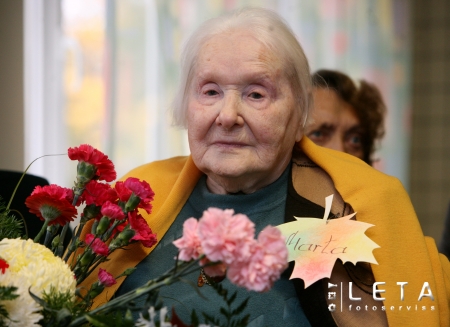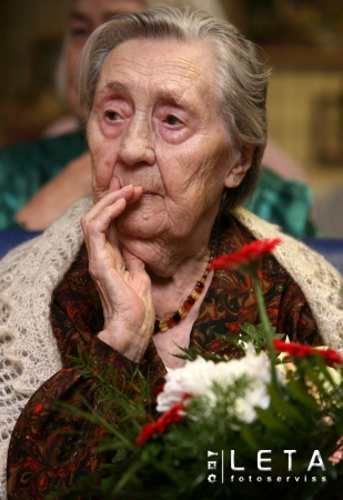 103 gadus vecā Aleksandrīna Jakovļeva ar ziediem ceturtajā ...