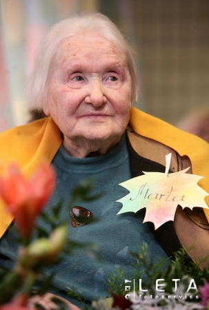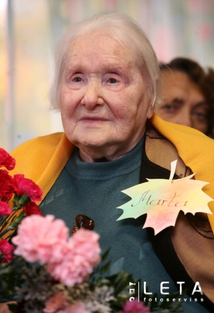 108 gadus vecā rīdziniece Marta Vabule ar dzimšanas dienā dāvātajiem ...