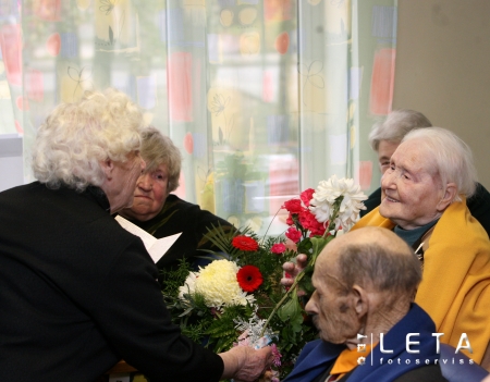 Simtgadniece Pelageja Kļaviņa ar ziediem ceturtajā simtgadnieku ...
