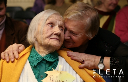 Simtgadniece Pelageja Kļaviņa (no kreisās) un 103 gadus vecā ...