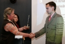 Latvijas Pašvaldību savienības padomniece Silvija Šimfa pasniedz ...